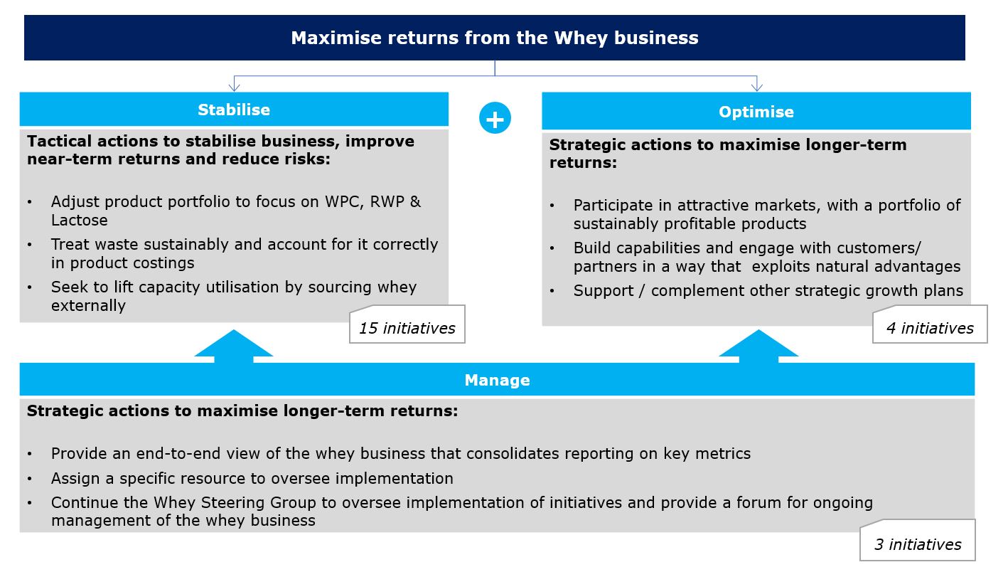 Our client, a large Australian dairy processor, had a large legacy position in whey, as a by-product of its significant cheese production operations. Management were unsure how best to handle whey, as it presented both an environmental and operational risk, and a commercial opportunity with several large, profitable industrial relationships. CACE Partners were asked to help them understand the risk and rewards associated with whey, and to develop a strategic action plan.